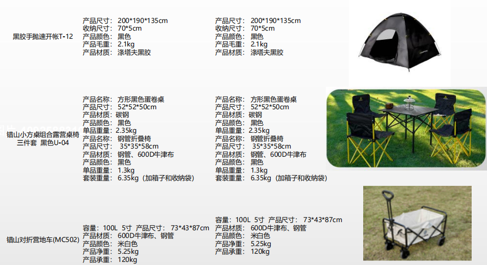 规格:黑胶手抛速开帐T-12+错山小方桌组合露营桌椅 三件套 黑色U-04+错山对折营地车(MC502)